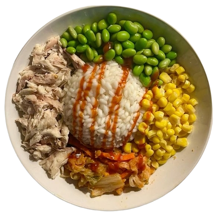 White plate with rice, meat and vegetables
